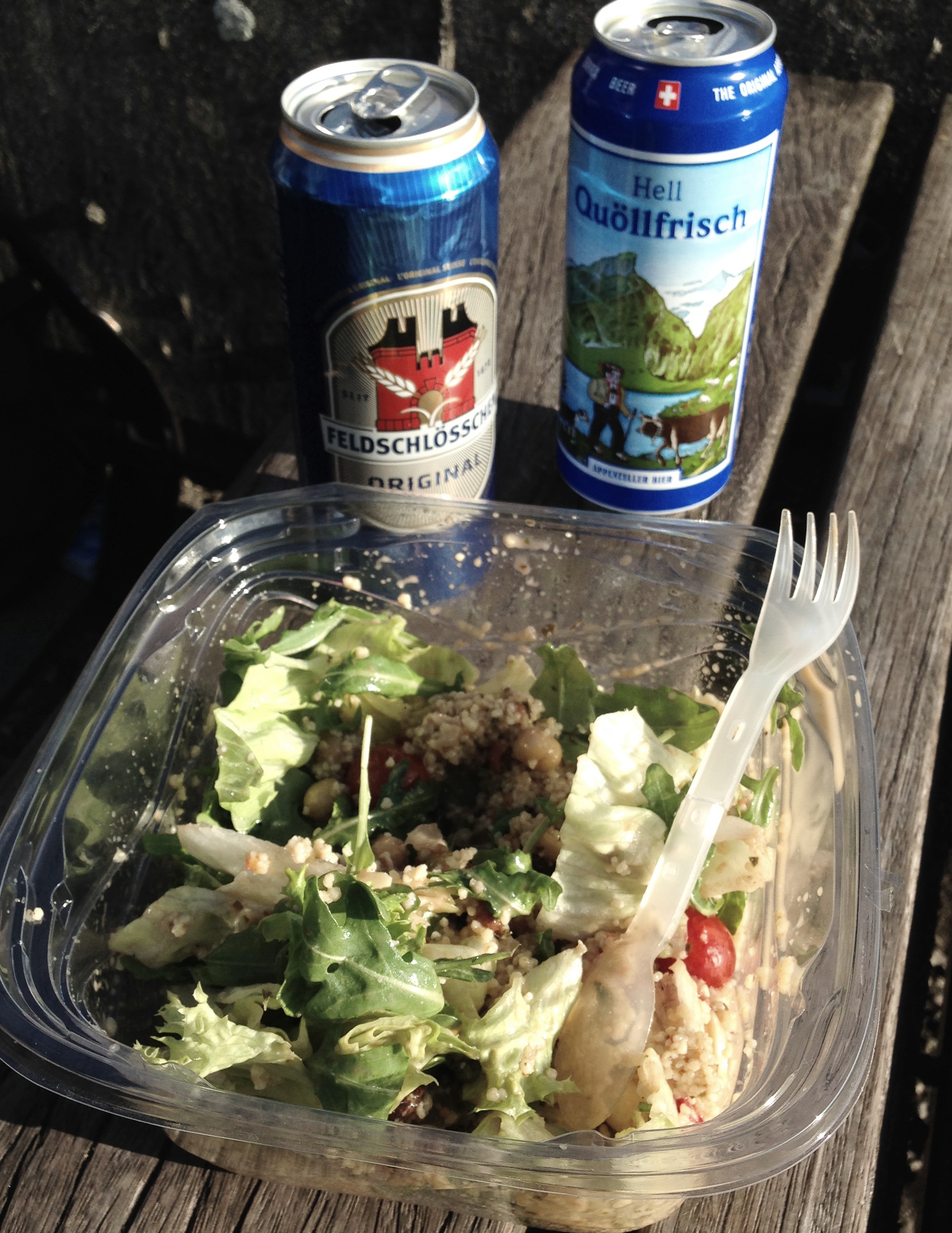 Make your own meals.  It pains me to offer this as a suggestion (as eating local foods made by local people is one of the most wonderful aspects of travel) but it is essential to avoid eating out if you want to save money.  Jaime has a particularly polarized opinion of eating in Switzerland.  She was furious to see the prices in the grocery stores for basic foods.  Simple self-catered meals had suddenly turned into big-budget endeavors.  She became particularly upset upon examining a tiny, sad-looking frozen cheese pizza at Migros (the cheapest grocery store) which cost more than our apartment in Frankfurt.  This is not an exaggeration.  There is another grocery chain named Coop which sells beer and wine late at night…we got lucky a few times and found an affordable bottle of red wine to split (those Olde English tall cans were obviously out of our price range at almost $7 each).